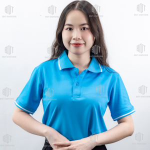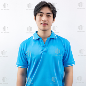 Đồng phục áo thun có cổ màu xanh da nhạt viền trắng